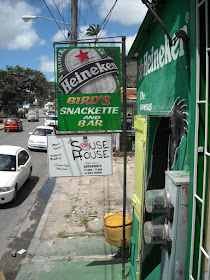 The Souse House sticks to regular health standards and offers steamed pudding, but when I tried their goods (minus the pickled steppers - that's chicken foot, not me bo') I added a new concept... Pickled Pig Tail, $3.00 each, everyone in Bim has had a BBQ pigtail sometime, but I never thought of curing it like souse! They have a very friendly young couple as cashier and waiter. Plenty rum and beer for the weekend warriors!